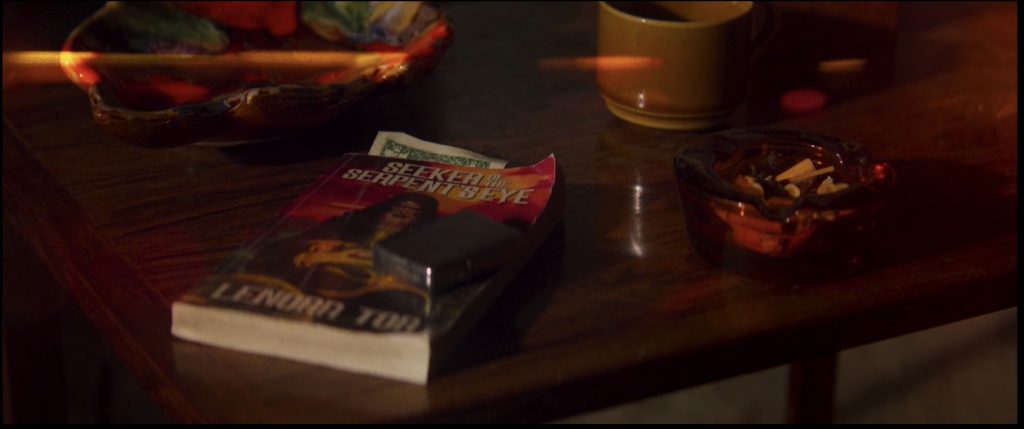 Mandy is reading a book, ‘Seeker of the Serpent’s Eye’ (surprise, surprise, the book’s cover is red). From what we can gather from the book’s title and the part we hear Mandy reading in this particular scene, the story involves a wretched warlock and his desire to acquire something that is not necessarily his for the taking (the book also mentions a crimson sky and blood-red sunlight, by the way).