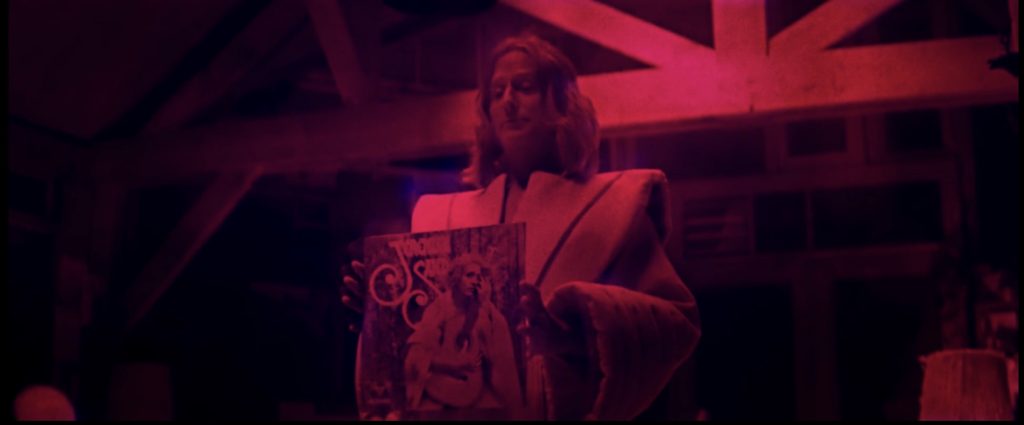 The women lead Mandy down the red and dimly lit hallway to the living room where the rest of the cult, including Jeremiah, is waiting and forces Mandy onto a chair. She is finding it hard to concentrate, thanks to whatever effect those eye-drops and that wasp stinger is having on her. Jeremiah demands that Mandy looks at him and then proceeds to kiss his own ass for almost 10 minutes straight. He plays his shitty music on the record player (comparing his music to the “sensational” Carpenters). He moves closer to Mandy and ends up face to face with her. As he tells her about this message he received from up-above about how he should take whatever he feels is rightfully his (and Jeremiah has this idea that this includes everything), he goes on and on about his “wants” and “needs” and even his “pleasures”.