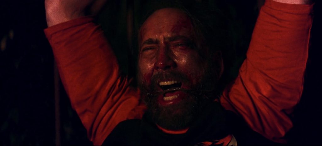 The scene abruptly cuts to Red outside. He is tied to a fence with barbed wire, severely injured, but still breathing (I know, I was worried about Nic Cage there for a second too).