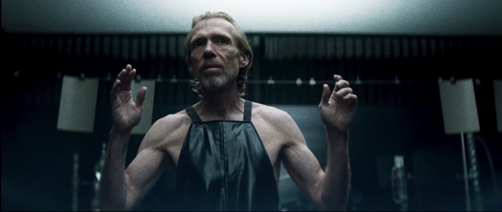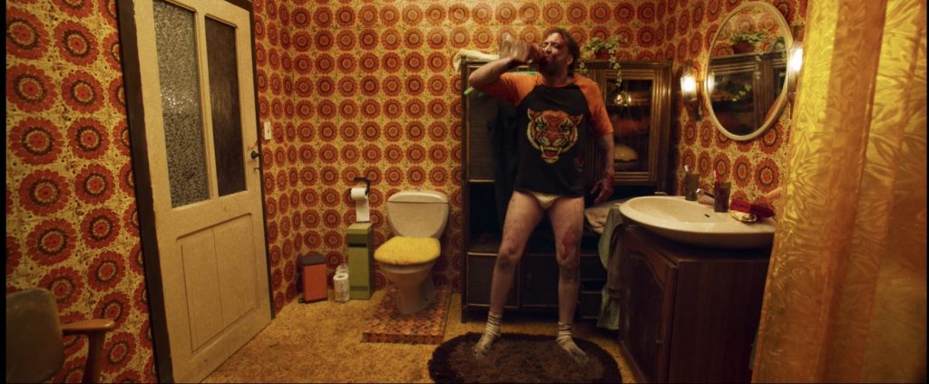 Almost the entire scene plays off in one still shot (Wes Anderson style). Red grabs a bottle of liquor from the cabinet underneath the sink. (At this point, some might ask, “Why the liquor in the bathroom cabinet?” and to them, I would say “We are an hour into Mandy, and this is the question you chose to ask? Get your shit together, man!”) He takes a big gulp of alcohol, throws some out onto his wounds and continues drinking. He cries out in pain and sobs uncontrollably while destroying everything he can get his hands on. He sits down on the toilet seat and continues to cry (and drink). The camera slowly moves (for the first time in the bathroom scene) closer to Red. A flash of anger clouds Red’s features and the scene ends.