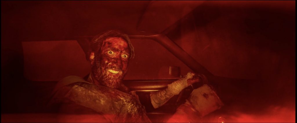 Red interrupts another member (this one has a knife for a penis) as he’s doing drugs and watching (very vanilla) porn. The two get into a tumble and the demon falls dick first into the floor and gets stuck. Red slits his throat and blood sprays across his face. The Skull from earlier reappears and Red, now covered in blood (the only thing not stained with red, is Cage’s distinctive crazy eyes) easily takes him out.